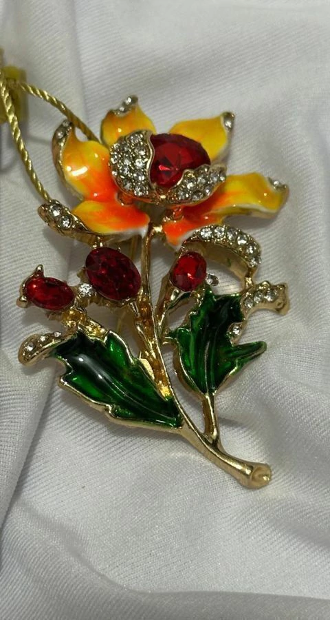 O design do Broche Flor é uma composição botânica detalhada. A flor principal, com suas pétalas em tons de amarelo e laranja, abriga pedras vermelhas centrais, cercadas por cristais. Delicados botões e folhas esmaltadas em verde completam o arranjo. A parte de trás possui um fecho de alfinete seguro, garantindo que a peça fique perfeitamente posicionada.