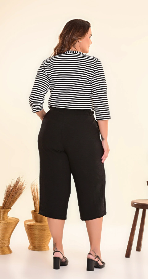 Como Usar: A pantacourt preta é uma das peças mais versáteis do guarda-roupa moderno. Para um look de trabalho, combine-a com uma camisa ou uma blusa estampada, como na foto. Para uma proposta monocromática sofisticada, use-a com uma blusa preta de seda. Ela transita perfeitamente entre sapatos de salto, para uma silhueta mais alongada, e rasteirinhas ou mules, para um conforto chique no fim de semana.