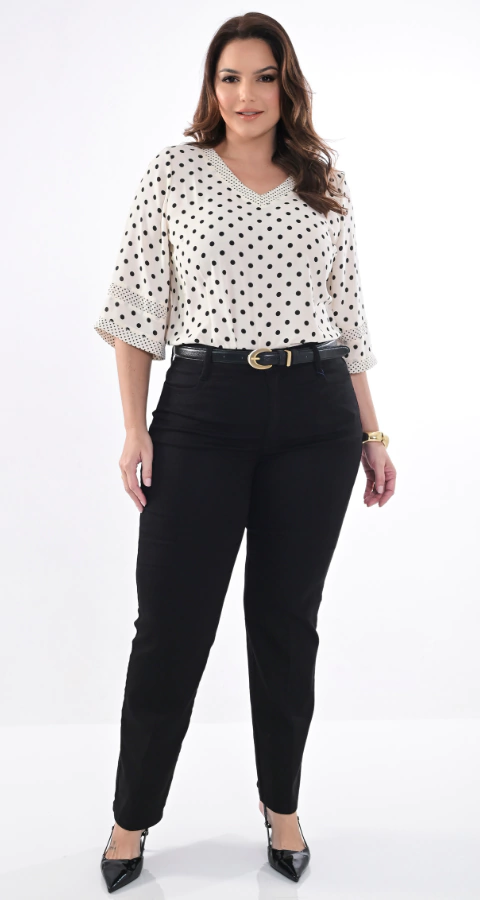 Como Usar: A calça jeans preta é uma peça curinga no seu guarda roupa. Para um look elegante, combine-a com camisas ou blusas em tons de off-white, bege ou com estampas terrosas, como na foto. Para uma proposta mais ousada, ela harmoniza lindamente com tons de verde ou laranja. Transita com perfeição entre sapatos de salto, para um visual mais arrumado, e sapatilhas ou botas, para o conforto do dia a dia.