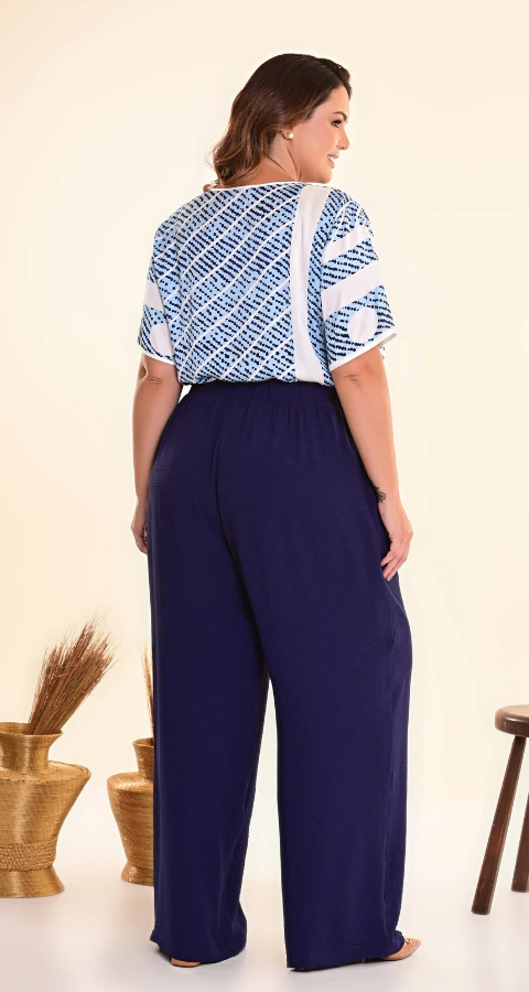 Como Usar: A calça pantalona azul marinho é uma base extremamente elegante e versátil. Para um look de trabalho sofisticado, combine-a com camisas de seda ou blusas estampadas, como na foto. Para uma proposta monocromática poderosa, use-a com outras peças no mesmo tom. Ela transita perfeitamente entre o salto alto, para uma ocasião mais formal, e as rasteirinhas ou tênis, para um look casual chic.