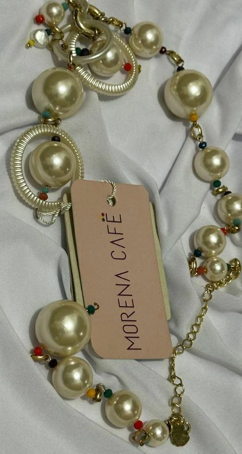 Este colar é uma rica combinação de materiais de alta qualidade. As pérolas sintéticas possuem um brilho intenso e uma superfície lisa, remetendo à beleza das joias clássicas. Elas são combinadas com detalhes em metal com banho dourado, que garantem durabilidade e um acabamento sofisticado. Os pequenos pontos de cor das miçangas adicionam um toque artesanal e alegre à peça.