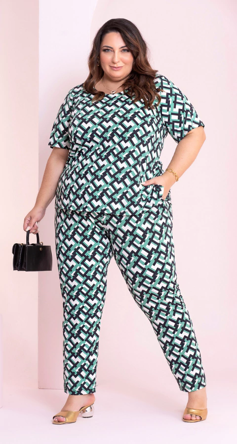 O conjunto Joice é a personificação da elegância gráfica, uma proposta de estilo que une conforto e um design moderno de forma impecável. Com sua sofisticada estampa geométrica em tons de verde, preto e branco, ele cria um visual de impacto com a praticidade de duas peças fluidas. É a escolha perfeita para a mulher que busca um look completo, que transborda personalidade e uma sofisticação contemporânea.