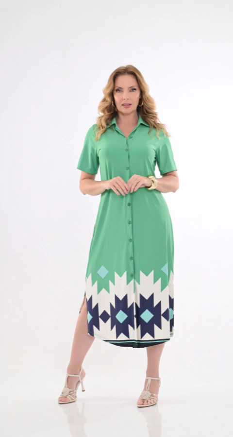 A modelagem chemise, com seu comprimento midi e corte reto, é um ícone de praticidade e elegância. A peça conta com gola colarinho clássica e abotoamento frontal completo, permitindo diversas formas de uso. A estampa geométrica nos tons harmoniosos é estrategicamente posicionada na barra, criando um efeito visual poderoso e único, que atrai o olhar e valoriza o design. As mangas curtas e o forro interno garantem um ajuste confortável e seguro.