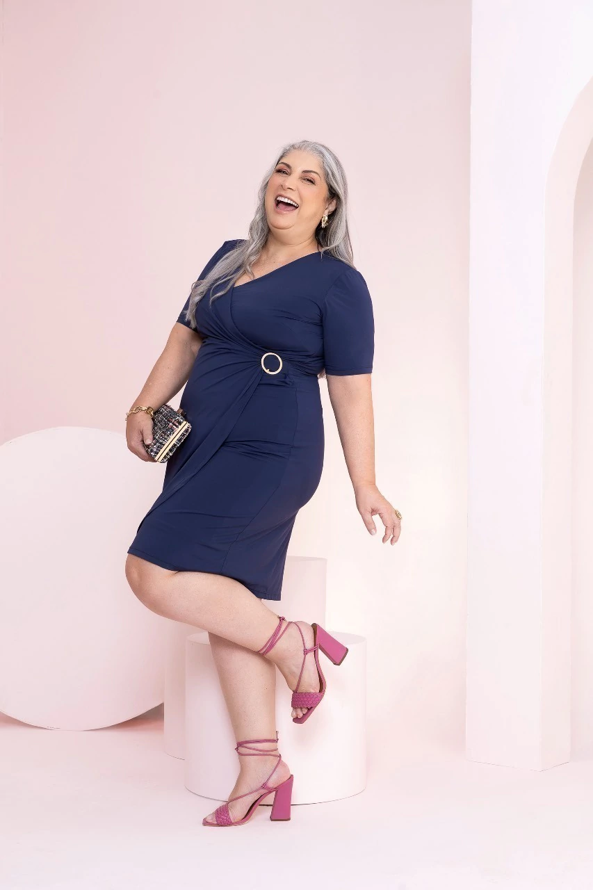 Como Usar: O azul marinho é um neutro de extrema elegância. Para um visual clássico, combine o vestido com sapatos e acessórios em tons de nude ou prata. Para uma proposta mais moderna, aposte em um ponto de cor, como uma bolsa ou sapatos em tons de vermelho ou amarelo. Acessórios em dourado harmonizam perfeitamente com o detalhe da fivela.